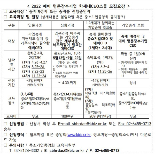 “2022 예비 명문장수기업 차세대 스쿨 교육생 CEO ” 모집안내 2022-03-31 0 20523 2022.03.31 10:00 2022.03.31 10:00 “2022 예비 명문장수기업 차세대 스쿨 교육생 CEO ” 모집안내.zip (3.1M) + 4