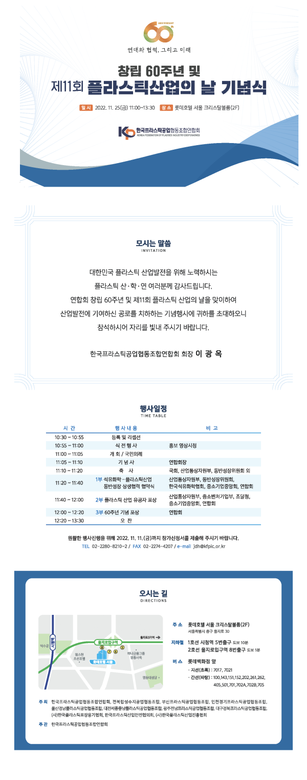 창립 60주년 및 제11회 플라스틱산업의날 기념식 안내 2022-11-03 0 20422 2022.11.03 16:18 2022.11.03 16:18 11회_플라스틱산업의날_참가신청서.pdf (623.9K) + 2