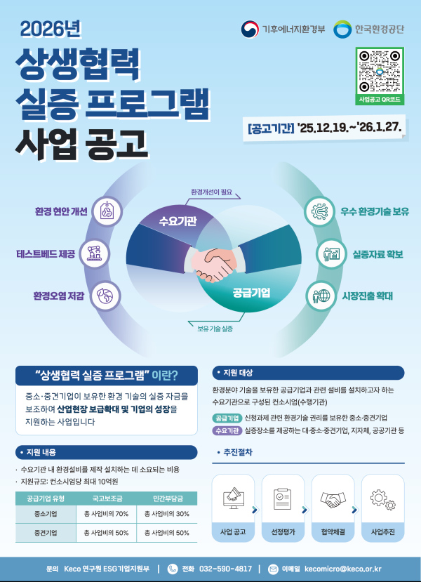 환경 분야 기술·설비의 상용화 촉진과 기업의 환경경영을 지원 하고자 「2026년 상생협력 실증 프로그램」 사업을
