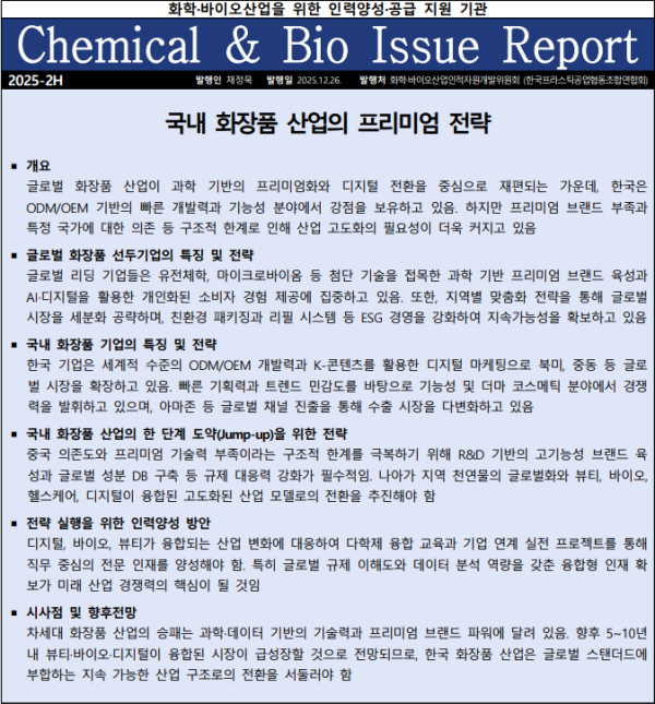 화학·바이오ISC, 2025년도 하반기 이슈리포트 발간 2026-01-12 연합회 0 214 01.12 10:11 2026.01.12 10:11 2025년 하반기 화학바이오ISC 이슈리포트.pdf (185.9K) + 0 화학·바이오산업인적자원개발위원회(CHEMISC)에서 작성한'국내 화장품 산업의 프리미엄 전략' 배포하오니 업무에 참고하시기 바랍니다.▶ 켐바이오넷(https://chembio.or.kr) 바로가기